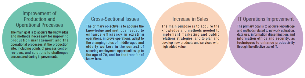 This training to support productivity improvement provides training to acquire the necessary knowledge and skills for small and medium-sized enterprises to improve their productivity, such as training middle-aged and older employees to ensure employment opportunities up to age 70, and developing human resources to contribute to the promotion of DX (digital transformation), through curricula that are effective in improving productivity in various industrial fields, such as production control, IoT, Cloud utilization, organizational management, marketing, etc. that are useful in improving productivity.