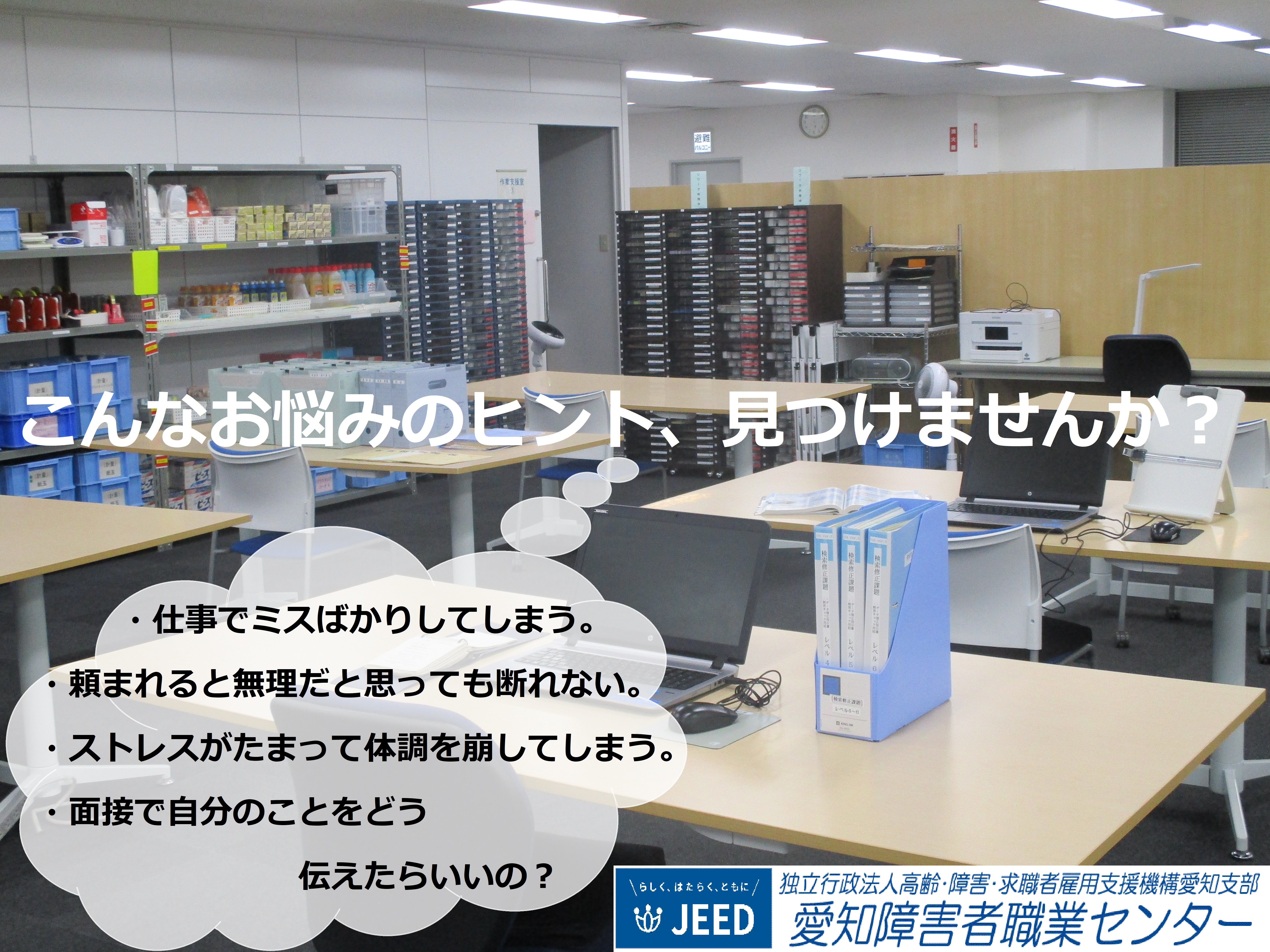 「職場対人技能トレーニング(JST)」「ストレス対処」「職場のルールとマナー」等をはじめとした講座の受講を通じて、安定した職業生活を送るためにに必要な知識を習得できるよう支援します。