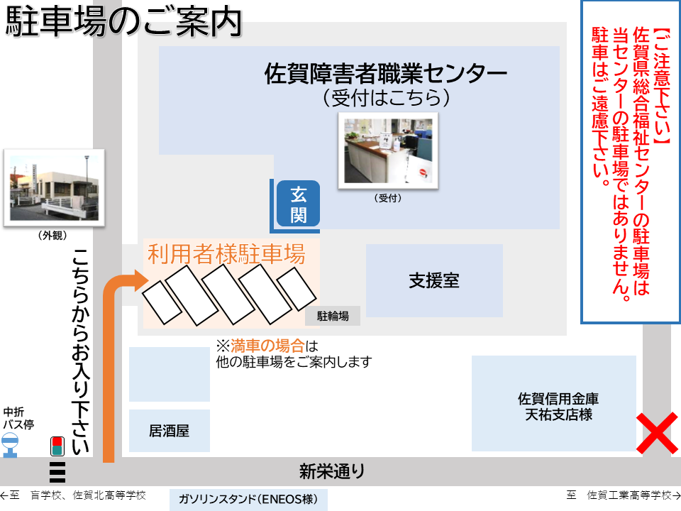 JR佐賀駅バスセンターから「4番のりば」市営バス58番・59番(中折経由各線)に乗車し、「中折」バス停で下車してください。(中折バス停から徒歩2分)