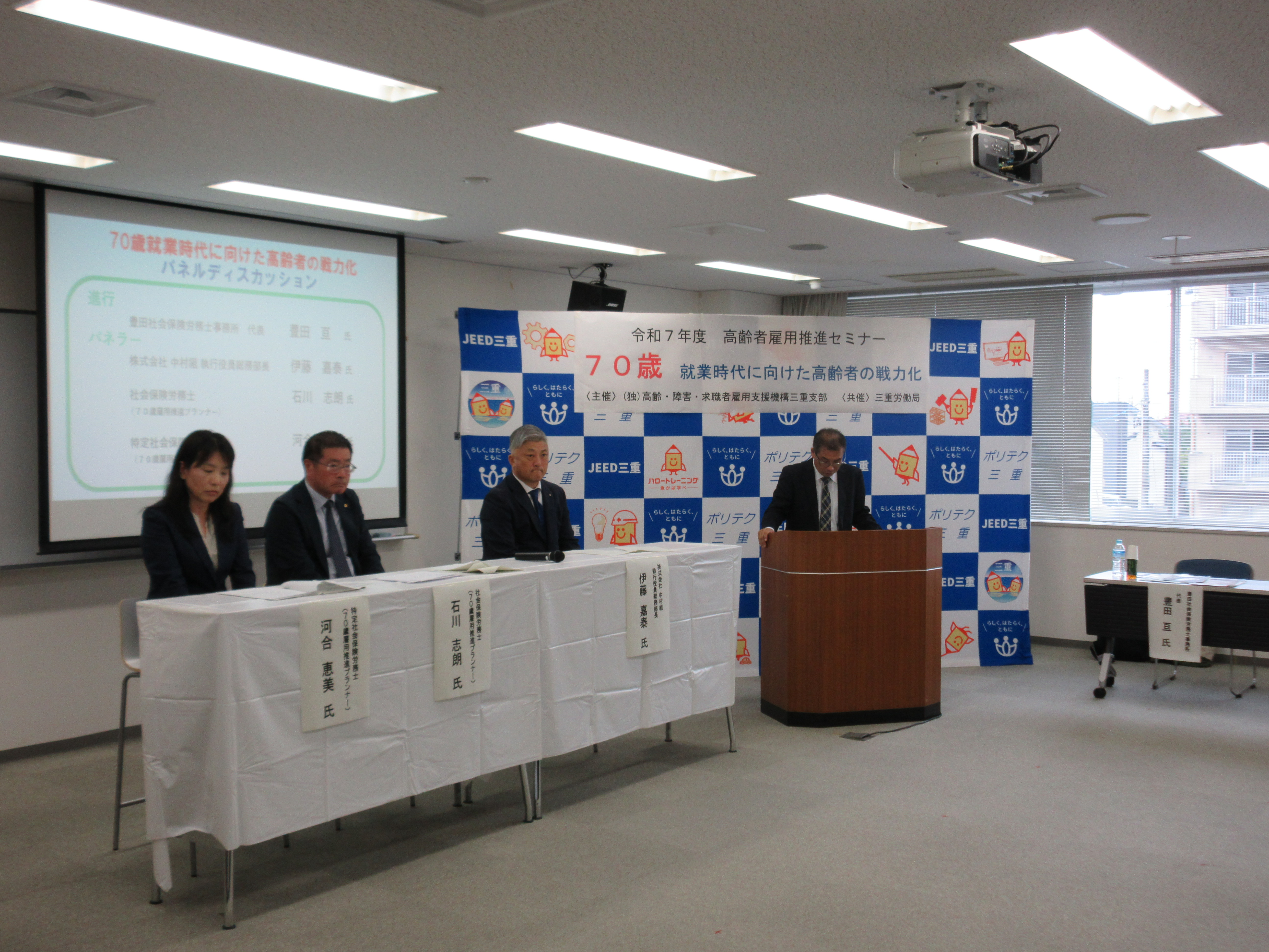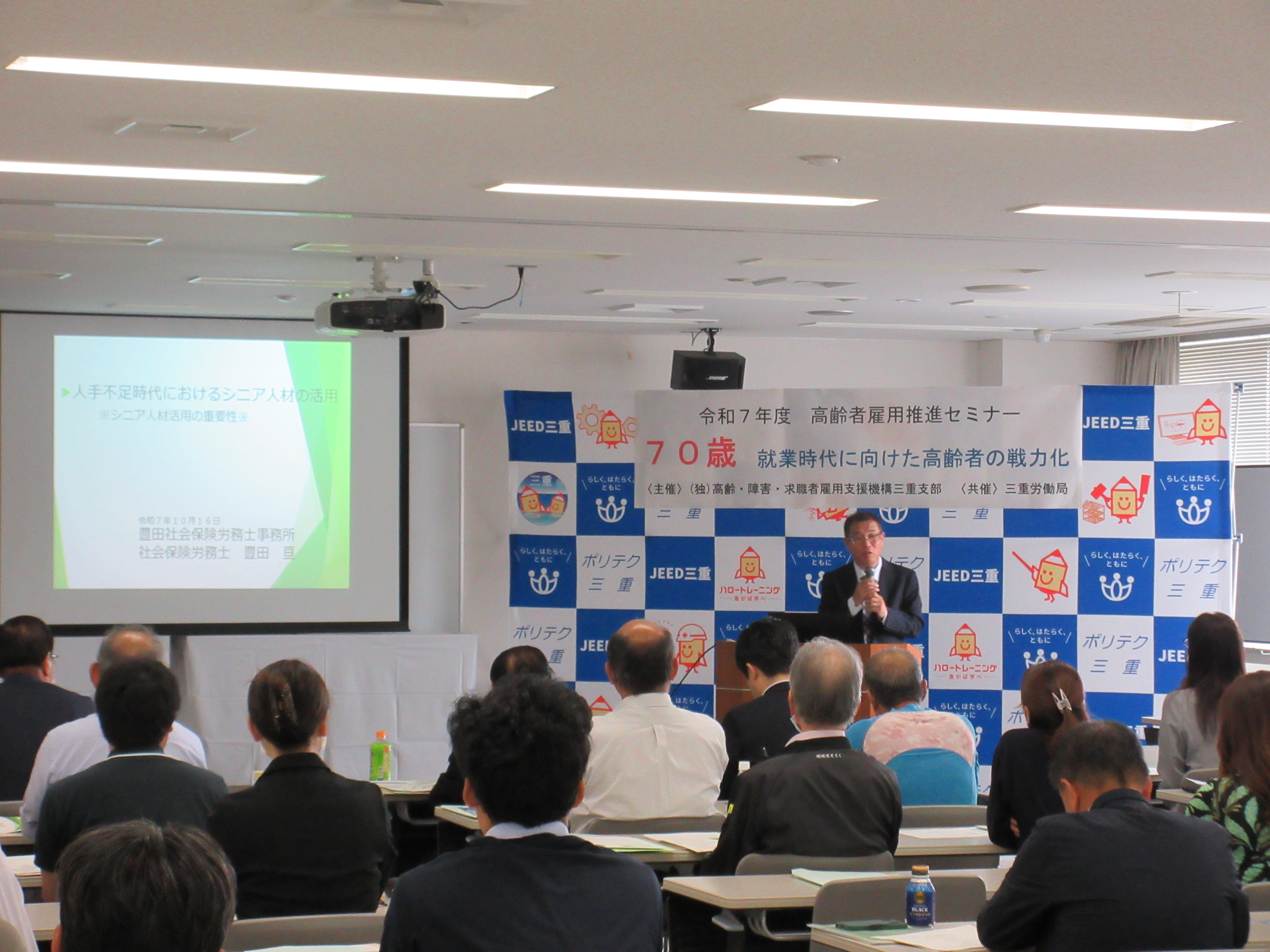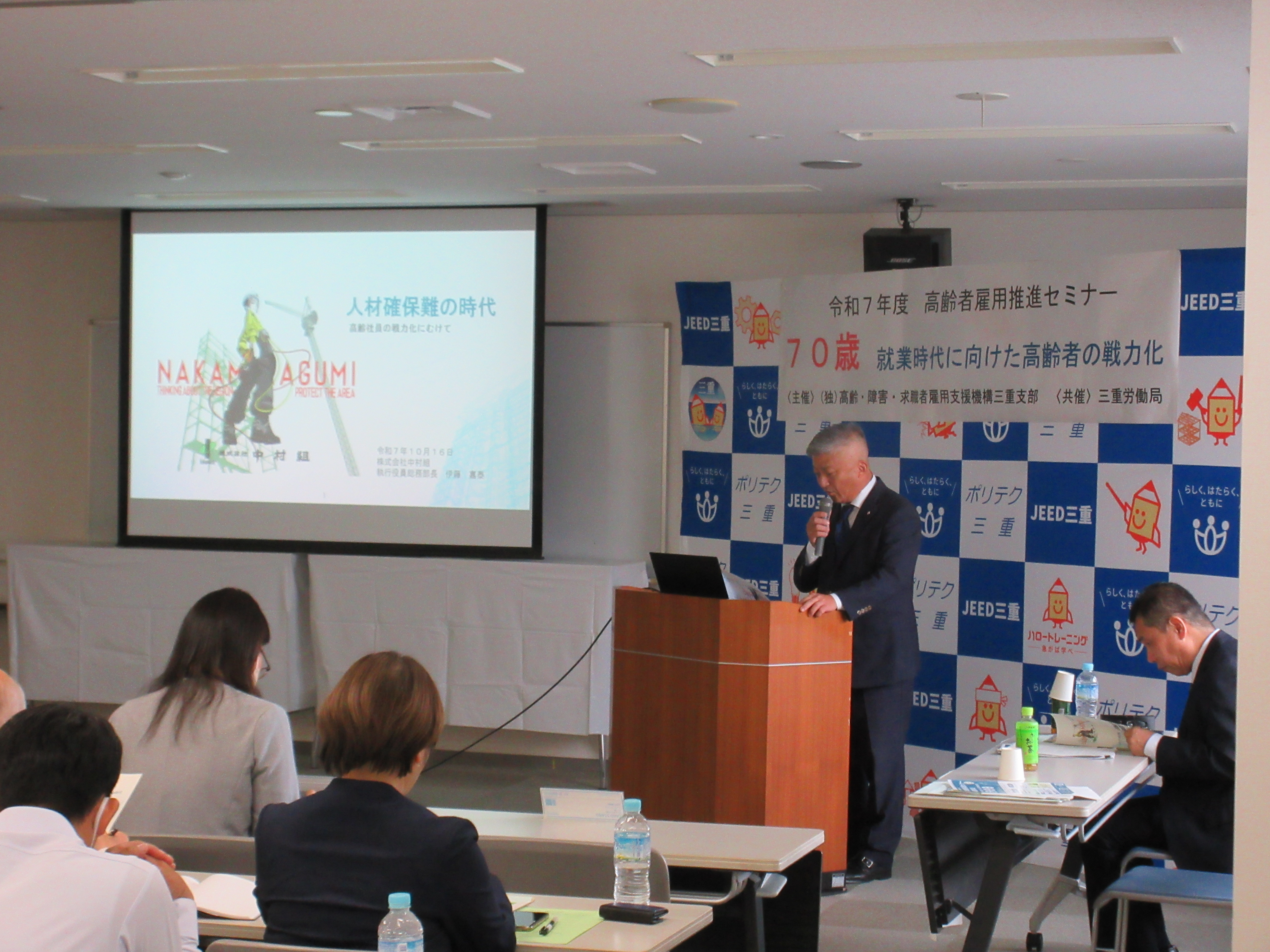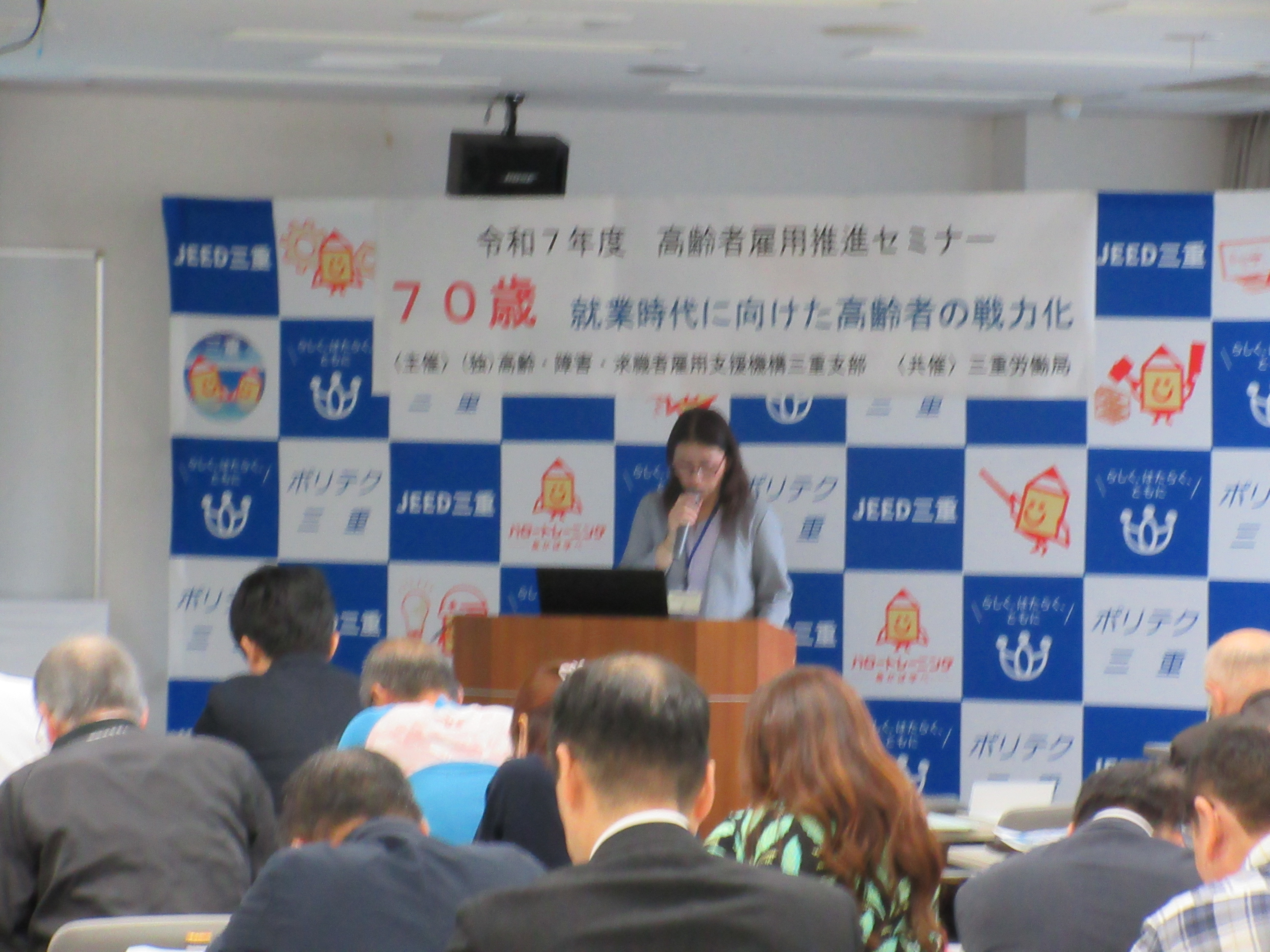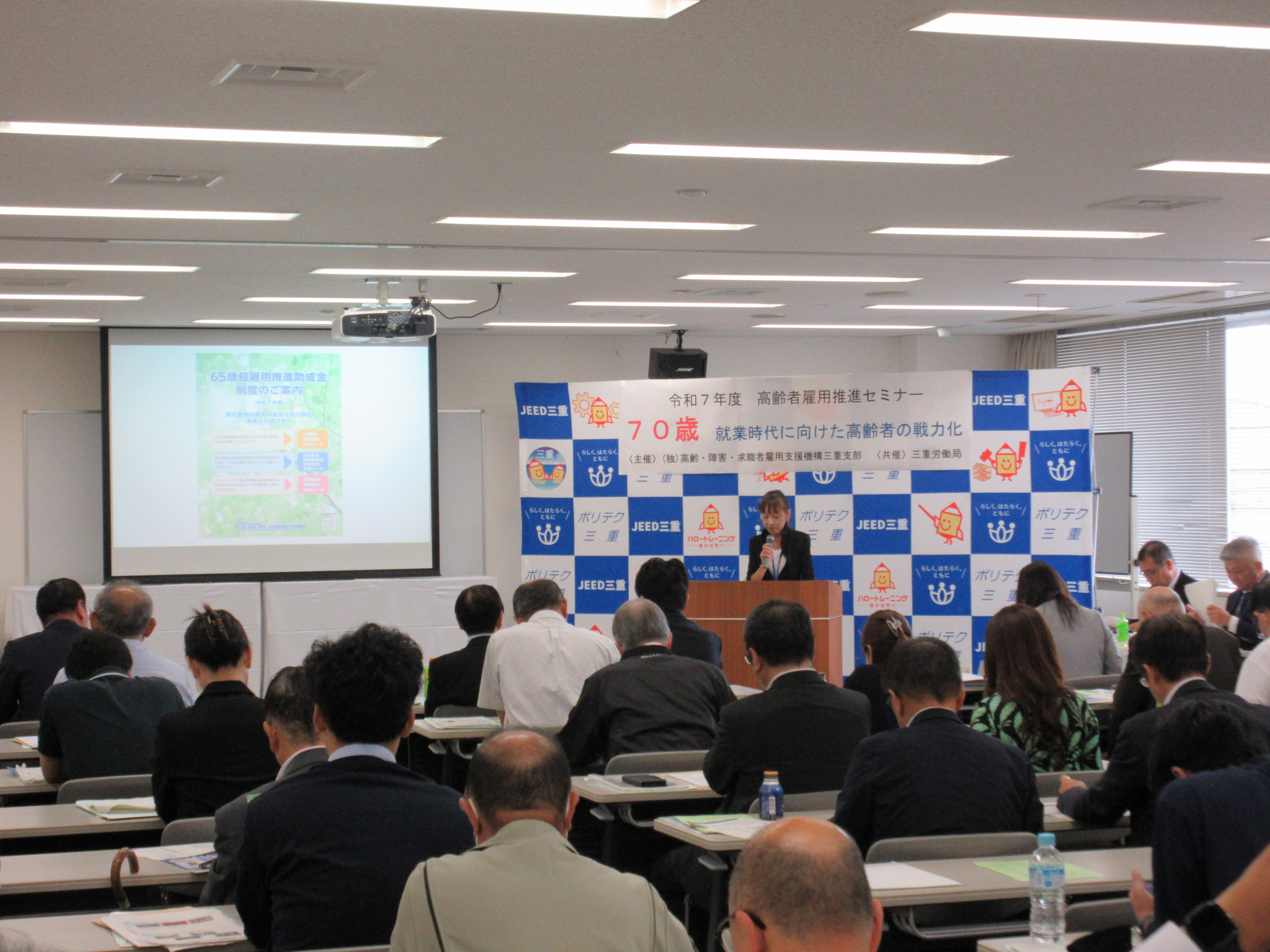 JEED 三重支部では、高齢者雇用の理解を深めていただくため、10月16日(木)、ハローワーク津 にて「令和7年度高齢者雇用推進セミナー」を開催しました。