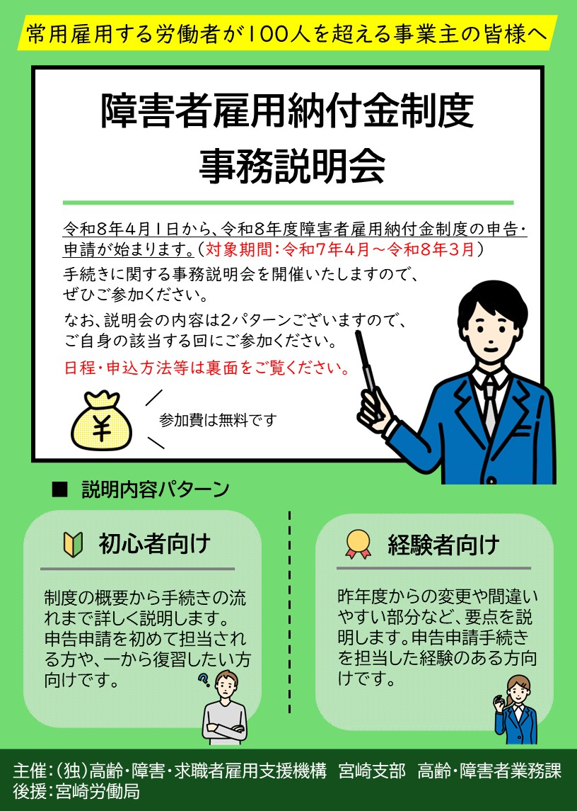 常用雇用労働者が100人を超える事業主様を対象として、障害者雇用納付金申告申請書作成に係る説明会を開催いたします。